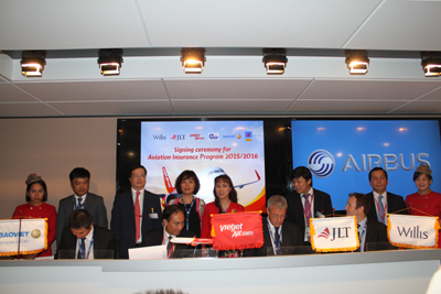In addition to the credit agreement at the Paris Air Show 2015, VietJet signed the major contracts with several partners for its fleet’s insurance package during 2015-2016 worth US$1.5 billion. British insurance giants Willis Group Holdings and JLT Group were appointed as brokers along with Vietnamese insurers, Bao Viet Holdings Company, PetroVietnam Insurance Joint Stock Corporation, and Global Insurance Corporation.