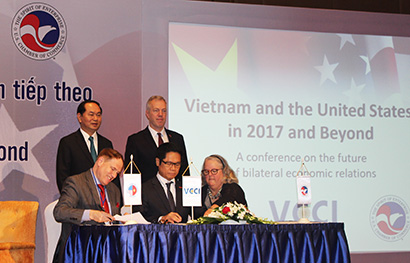 In the witness of President Tran Dai Quang and H.E. Ted Osius, US Ambassador to Vietnam, at the conference, Dr. Vu Tien Loc, VCCI President and Mr. Michael Kelly, Vice President of AmCham Hanoi, and Ms. Tami Overby, Vice President of the US Trade Association, signed a Memorandum of Understanding on trade facilitation.