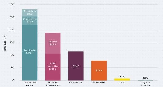 According to a Savills Impacts report, at the end of 2017, the value of the world’s real estate reached US$280.6 trillion, of which approximately 78% is residential property. To give this figure context, global GDP is US$78.3 trillion, accounting for 30% of global real estate.