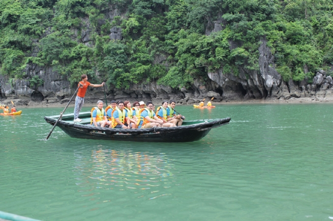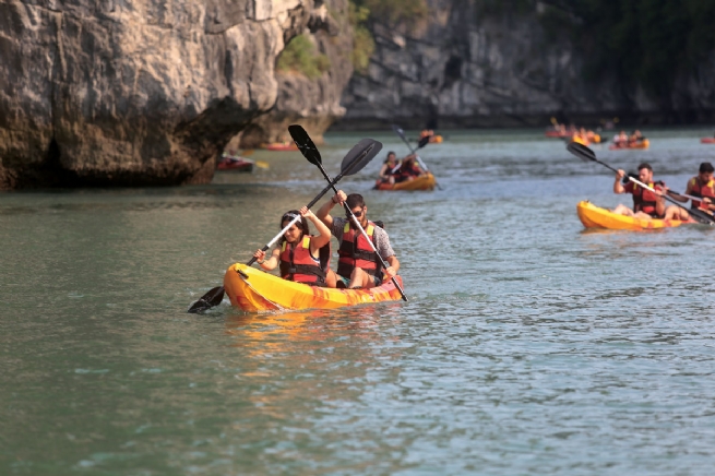 To visit the Vung Vieng fishing village, visitors can use a small boat or Kayak. Sitting on the boat, visitors fully enjoy the beautiful scenery of Ha Long Bay and listen to the interesting sharing stories of the ferryman. Visitors interested in sports and exploring can choose to visit the fishing village by kayaking. The limestone mountains are covered with a green color that reflects on water, the bright rays have the opportunity to show their shimmer. What a beautiful picture!