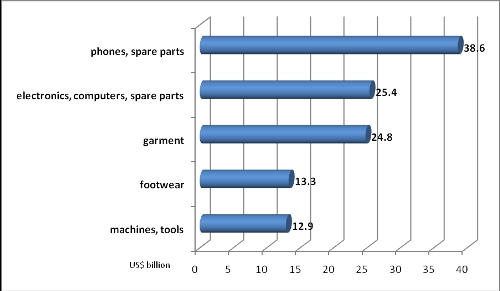 As many as 26 export items joined the US$1 billion export club in nine months, making up 89.9% of the total export value, five ones of which shows the export value exceeding US$10 billion, accounting for 59.2%.