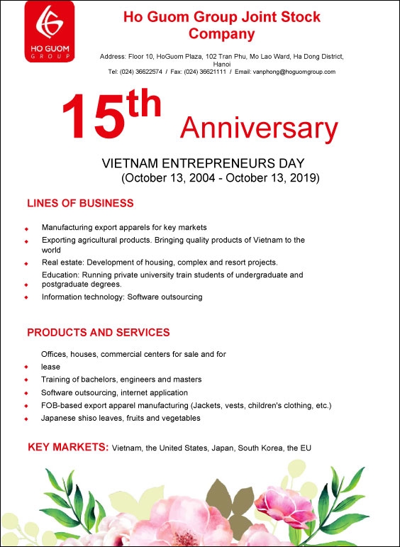 Ho Guom Group Joint Stock Company, formerly known as Ho Guom Garment Joint Stock Company, has constantly expanded its business lines to become a multi-industry enterprise engaged in such areas as apparel, real estate, education, and information technology. On the accasion of the Vietnam Entrepreneurs Day, Ho Guom Group Joint Stock Company has sent congratulations to all entrepreneurs nationwide.