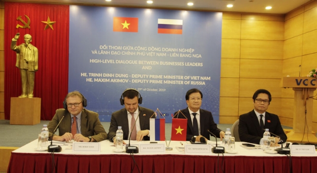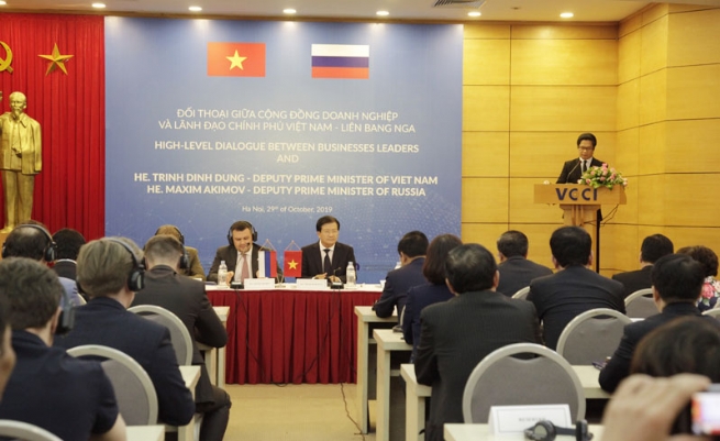 On October 29, 2019, at the 22nd meeting of the Vietnam - Russia Intergovernmental Committee, VCCI collaborated with the Presidential Council for Civil Society and Human Rights to organize a dialogue meeting for enterprises with government officials of the two countries, chaired by Vietnamese Deputy Prime Minister Trinh Dinh Dung and Russian Deputy Prime Minister Akimov. The two Deputy Prime Ministers delivered speeches and talked to nearly 200 Vietnamese and Russian businesses on issues of mutual concern.