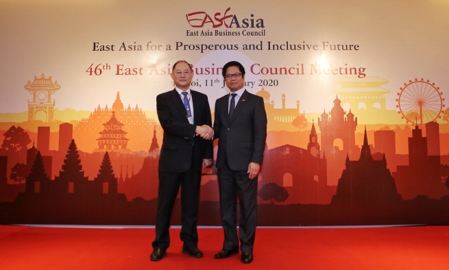 Recently, business leaders from 13 East Asian countries that are members of the East Asia Business Council (EABC) attended the 46th EABC Meeting in Hanoi, Vietnam to witness the transfer of the EABC Chairmanship 2020 from Dr. Lu Pengqi, Vice Chairman of the China Council for the Promotion of International Trade (CCPIT) to Dr. Vu Tien Loc, President of the Vietnam Chamber of Commerce and Industry (VCCI).