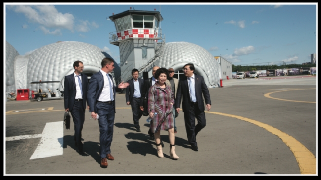 In the photo, Madam Thai Huong and former Vietnamese Ambassador to Russia took a helicopter to explore a dairy farm in Moscow.