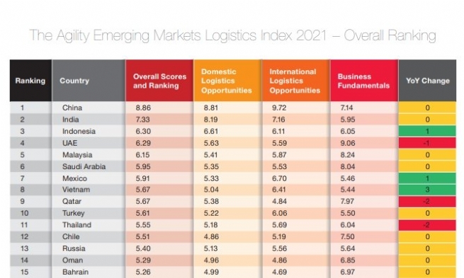Accordingly, China remained the world's leading emerging logistics market followed by India, while Indonesia ranked in third position. Qatar and Turkey ranked behind Vietnam in 9th and 10th position. Among ASEAN countries, Indonesia ranked third, Malaysia ranked fifth, Vietnam ranked 8th, Thailand ranked 11th, Philippines ranked 21st and Cambodia 41st.