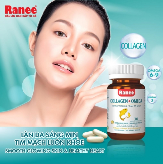 The food for health, RANEE COLLAGEN + OMEGA, contains the golden active ingredients that are highly praised by beauticians, created from the blend of outstanding properties and complementary effects to work to full. Inputs are extracted from salmon and pangasius which are rich in a red protein known as the “anti-aging queen” with abundant Omega 3-6-9 and other nutrients. Other essential substances DHA and EPA play a role in nourishing and restoring the complexion and enhancing the reproduction of new cells and quickly healing scars.