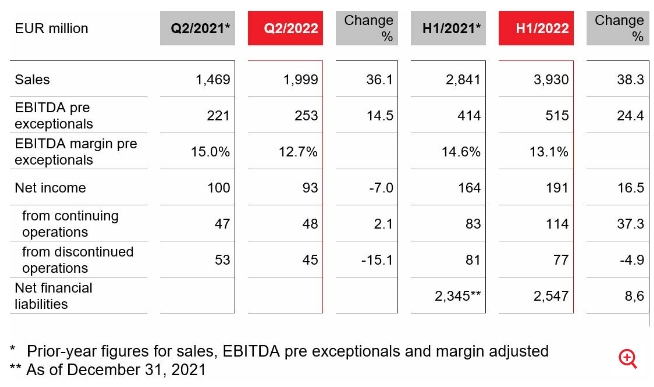 Group sales of EUR 1.999 billion were a considerable 36.1 percent higher than the prior-year quarter’s EUR 1.469 billion. The higher selling prices in particular had a positive effect. Net income from continuing operations amounted to EUR 48 million in the second quarter, slightly above previous year’s figure of EUR 47 million.