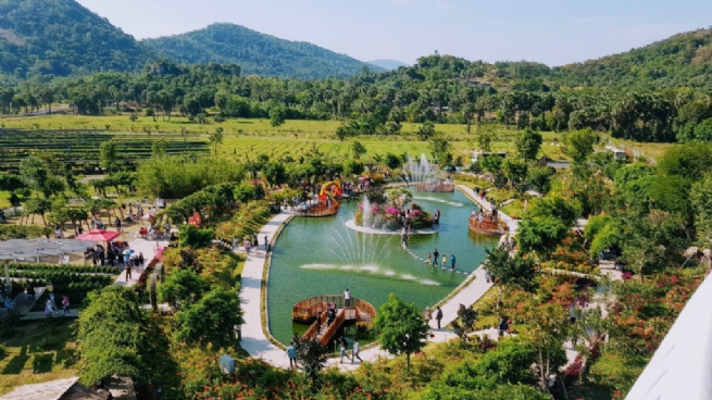 This place is surrounded by a tropical garden interwoven with thousands of roses, bougainvillea and hydrangea... swaying in the wind. Thien Canh lake gets its water from the upstream in the center with a cool emerald color. The entire area is planned like a paradise on the semi-mountain area. Lost in the entrance to the sightseeing area, it allows us to think of a 3-star resort in the solar power field.