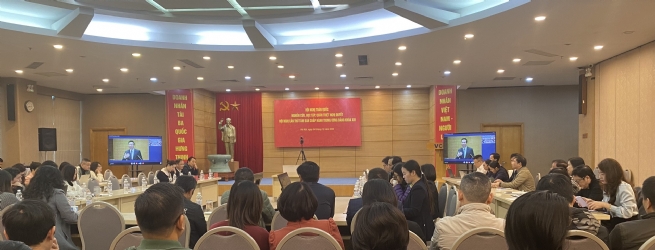 VCCI’s leaders and officials gather at the VCCI headquarters for the hybrid conference on studying the resolution released at the eighth session of the 13th Party Central Committee