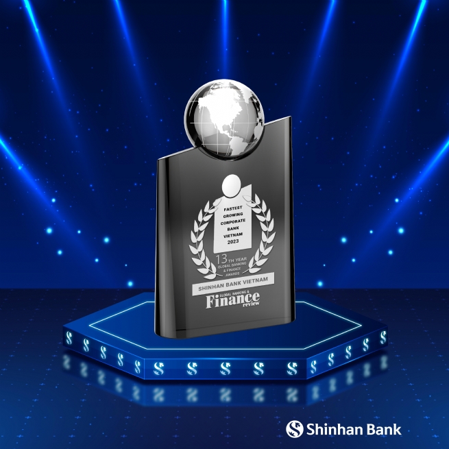 Shinhan Bank receives the "Fastest Growing Corporate Bank in Vietnam Award 2023" from Global Banking and Finance Review, acknowledging its robust growth in corporate business