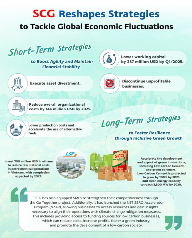 SCG expects its revenue for 2024 to increase by 3% from the previous year, despite severe global economic volatility, a prolonged global petrochemical downturn, the Middle East conflict, increased competition from Chinese products in the domestic market, and fluctuations in the Thai baht. These challenges pose obstacles to business operations and are likely to persist for an extended period. As a result, SCG is focusing on conducting its business with increased caution and prudence. The company has set key targets, including: 1) reducing overall organizational costs by 3.57 trillion VND (144 million USD) by 2025, 2) lowering working capital by 7.14 trillion VND (287 million USD) by Q1/2025, 3) discontinuing unprofitable businesses, such as SCG Express and the digital technology business OITOLABS in India, with other operations also under review for potential discontinuation, and 4) executing asset divestments to enhance agility and focus on maintaining financial stability.