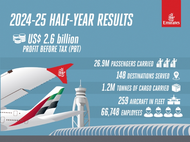 The Emirates Group announced its best-ever half-year financial performance, posting a profit before tax of AED 10.4 billion (US$ 2.8 billion) for the first six months of 2024-25, surpassing its record profit before tax for the same period last year.