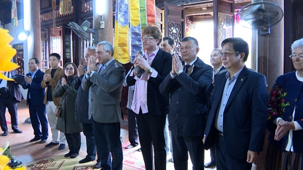 At Son Dong craft village, the delegation of the World Craft Council and the Mayors of Uzbekistan cities and artisans visited the Son Dong Craft Ancestor Temple, Dien Phuc Pagoda, and visited the production and processing facilities and the exhibition area of handicraft products of Son Dong artisans.