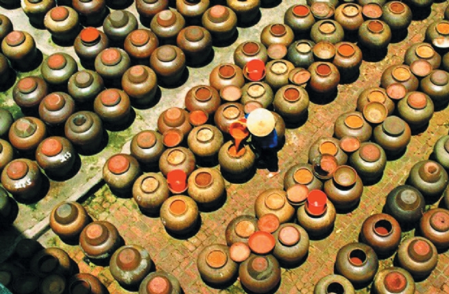 Roasting the well-done soybeans is a delicate step requiring skills. The beans must be roasted slowly with low heat and persistently stirred to prevent burning. After roasting, they are hulled, simmered over a wood fire until they get soft, then soaked in ceramic jars until they float. Meanwhile, the glutinous rice is thoroughly rinsed, steamed until it becomes tender, and left to ferment. Once the fermented rice becomes slightly yellow, it is combined with the soybeans and fermented soybean water in sealed jars. The sauce ferments for 15 to 25 days to be attractively aromatic, depending on the weather. Intense summertime temperature is ideal for speeding up fermentation. The sauce is stored in ceramic jars covered with cloth to prevent contamination and left under the summer sun for several months until fully matured. Then, the sauce is put into ceramic containers for distribution.
