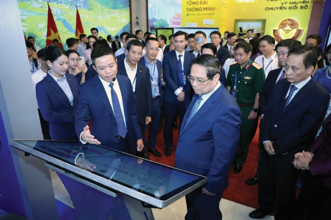 Prime Minister Pham Minh Chinh visits a booth at the 2025 Banking Digital Transformation event