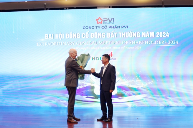Mr. Jens Holger Wohlthat, Chairman of the Board of Directors of PVI Holdings, presents flowers to Mr. Nguyen Tuan Tu, the newly appointed General Director