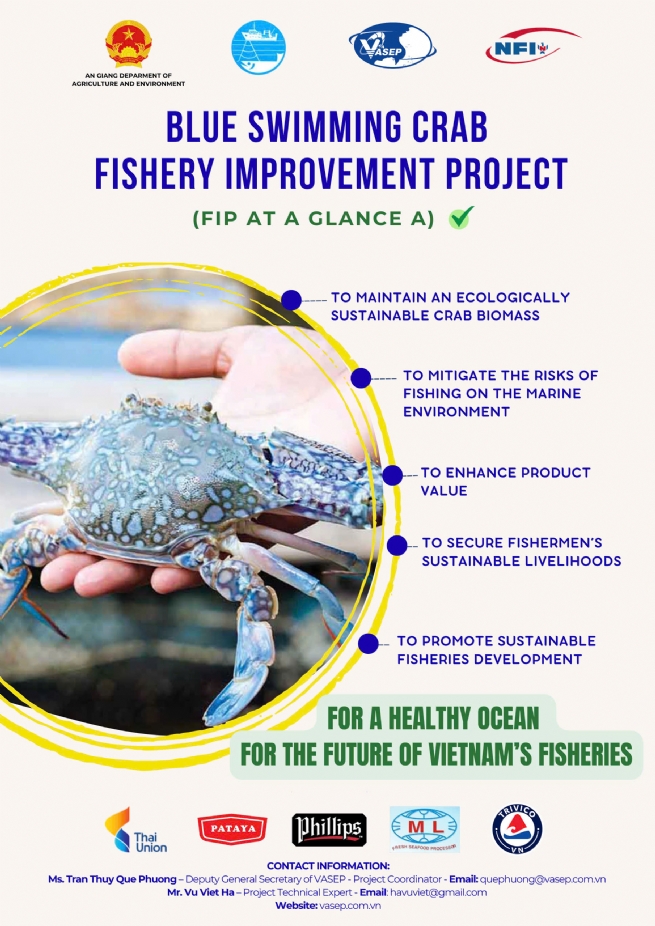 The Kien Giang Blue Swimming Crab Fishery Improvement Project (FIP) is implemented by the People's Committee of Kien Giang Province and the Crab Council of the Vietnam Association of Seafood Exporters and Producers (VASEP). Coordinating partners include WWF Vietnam , with consultation from the Research Institute for Marine Fisheries (RIMF) and the Nha Trang Institute of Oceanography (IO).