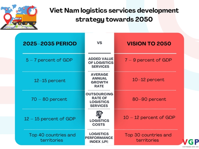 By 2050, logistics services are expected to account for 7–9 percent of GDP, growing 10–12 percent annually, with the outsourcing rate reaching 80–90 percent and logistics costs reduced to 10–12 percent of GDP. Viet Nam also aims to rank among the world's top 30 in the LPI, with all logistics enterprises fully implementing digital transformation solutions.