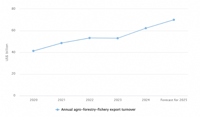 Export value of agro-forestry-fishery products is likely to reach a record high of US$70 billion in 2025, said Deputy Minister of Agriculture and Environment Phung Duc Tien.