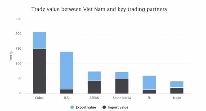The U.S. remained the biggest importer of Vietnamese goods with US$126.2 billion while China was the largest supplier with US$150.9 billion.