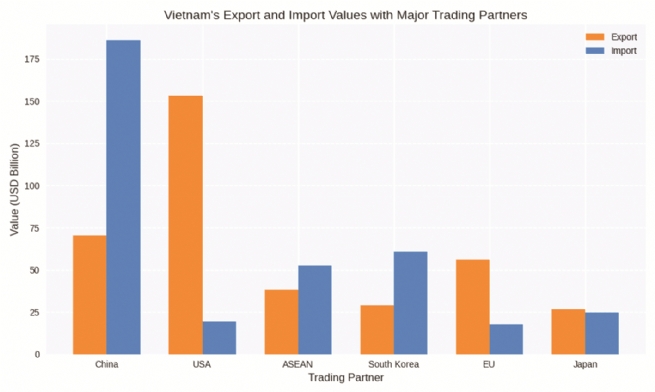At present, the U.S. was the largest export market, accounting for over 32%, while China led imports at around 40%. This reality showed risks of dependence on two traditional markets. In addition, FDI enterprises accounted for 70-75% of export turnover, but value added retained in Vietnam remained low, mainly concentrated in assembly, while higher-value stages such as branding, marketing, and supply chains were incomplete. The trade balance was also skewed, with a surplus with the U.S. and a deficit with China.