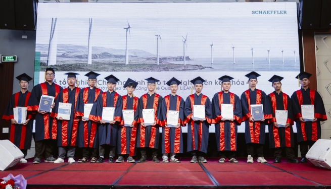 To date, three batches have graduated from the program, with a total of 47 apprentices. Graduates receive a nationally accredited diploma from LILAMA 2 International Technology College, a Schaeffler Graduation Certificate, and a Vietnam-Germany Joint Training Certificate aligned with German training standards.