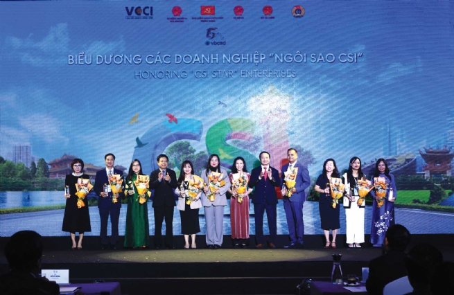 VCCI President Ho Sy Hung and Vice VCCI President Nguyen Quang Vinh award the “CSI Star” trophy to companies that have secured the Top 10 Sustainable Companies title for more than five consecutive years