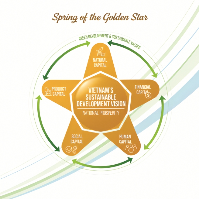 A five-pointed yellow star representing natural, financial, human, social, and product capital for green development and long-term prosperity