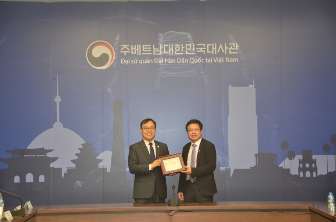 VCCI President Ho Sy Hung presents a commemorative gift to Ambassador Choi Young-sam