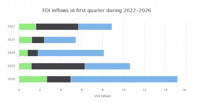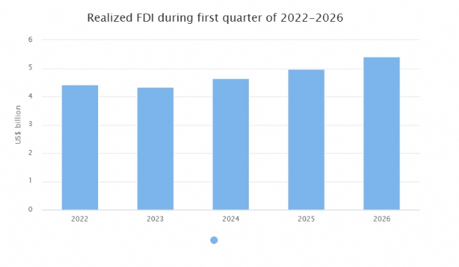 Disbursed volume of foreign direct investment (FDI) in Viet Nam in the first quarter of this year was estimated at US$5.41 billion, a year-on-year increase of 9.1 percent, the highest level during the 2022–2026 period.