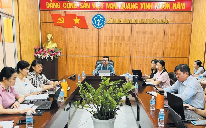 Mr. Vo Khanh Binh, Director of Tien Giang Social Security Agency, guides the implementation of Decree 75 in a meeting with Health Insurance Assessment Department leaders and officials.