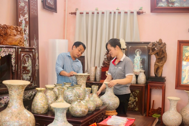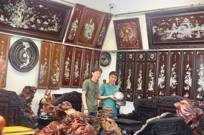 In Chuyen My village, known as the ancestral land of traditional mother-of-pearl inlay in southern Hanoi, it is common to see artisans working diligently at the inlay table, carefully attaching each small snail piece and shiny mother-of-pearl segment to the wooden surface. At the center of this activity, Vu Van Dinh's production facility stands out as a prominent highlight of the craft commune. With outstanding product lines including multi-purpose mother-of-pearl inlaid boxes, lacquer disc paintings, and intricately inlaid wooden vases, his facility has secured a strong position in the hearts of consumers, particularly for high-end gifts and souvenirs. Notably, all mother-of-pearl and shell inlay materials are carefully selected and imported from Singapore, India, and other sources.