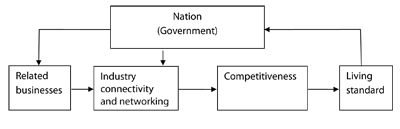 Today, it is hard to accept that when walking out of an international airport we can only find taxi and bus service, but cannot find a railway station. Furthermore, an important factor creating the modern city often is the river. We cannot develop a modern and sustainable urban area when ignoring the development of the river because this is one of the most important and basic environmental factors of the urban area. To solve that problem, in developed countries, people often associate waterways solution with other traffic solutions and develop the riverside areas to be more clean and beautiful. In the long term, the society will have to pay a very expensive price for the lack of linked development and the nation will lack competitiveness and sustainable development. In the best case, the country is only facing the trap of average growth compare with the rest of the world. However, theoretical economic management has shown a critical way to improve competitiveness through Industry connectivity and networking (shown in diagram 1). Thus, we can see that the Government can participate in improving competitiveness through microeconomic policies for business and macroeconomic policies or programs of international economic integration for the industries. However, Industry connectivity and networking (including related companies involve in the process of creating value for the product) is the direct strategy to enhance competitiveness of the nation, industries, businesses and products. This also means something very important in developing associations; that we should balance the development of members on the basis of Industry connectivity and networking (vertical) with a common interest of developing members with the basis of the same works (horizontal), because otherwise conflict and unfair competition or inefficiencies spread.
