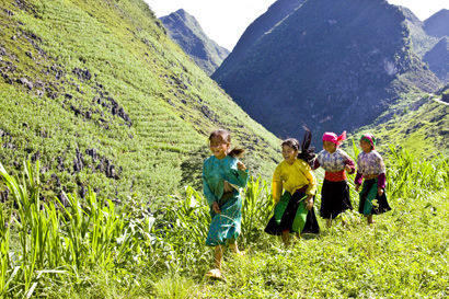 The sunlight of a new day falls on the valleys in Dong Van in the sounds of smiles, voices, footsteps, vehicles, rattles and horse steps at the market fair. Young ethnic minority girls are very beautiful in brilliantly colourful costumes, which they meticulously embroidered themselves over months. The market glows with colourful costumes of young Mong, Dao, Tay, Nung and other ethnic girls as a garden full of blossoming flowers.