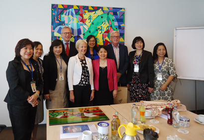 Ms Nguyen Thi Tuyet Minh, Chairwoman of VWEC and Chairperson of the ASEAN Women Enterprises Network (AWEN), had a meeting with GSW President Irene Natividad, representatives from the Organisation for Economic Cooperation and Development (OECD), and AWEN members on the evening of June 4, 2014 at Marriod Hotel. She raised issues of ASEAN women entrepreneurs’ interests, proposed the GSW and the OECD to coordinate in carrying out support activities and promoting the development of ASEAN women entrepreneurs, suggested cooperation mechanism with the GSW through connecting ASEAN women entrepreneurs with APEC women entrepreneurs, OCED women entrepreneurs and GSW women entrepreneurs. AWEN also sent its recommendations to annual themes of GSW.