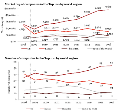· The US extended its leading position with 54 companies this year, up from 53 last year. The US share by market capitalisation increased from 57% to 62% (a gross increase of $314bn). All the Top 10 are now US companies.