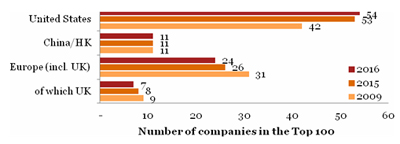 · The UK keeps its third position with 7 companies in the Top 100, but down from 8 companies last year.