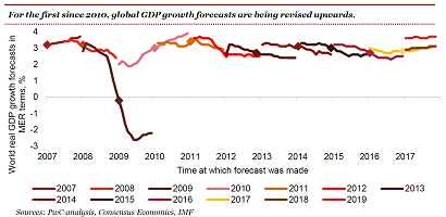 Barret Kupelian, senior economist at PwC, comments: “In 2018, we expect global economic activity to grow at its fastest rate since at least 2011, with the three main engines of the global economy - the US, Eurozone and Asia - growing in tandem. However, there are some downside risks businesses should be monitoring including the progress of the Brexit negotiations, key elections in large economies and protectionist tendencies in some nice sectors of the economy.”