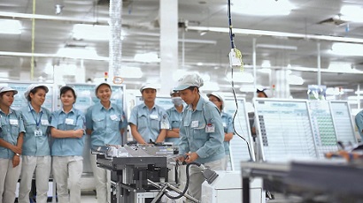Workers are testing new machine at Panasonic System Networks Vietnam Co., Ltd.