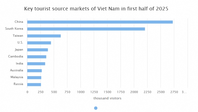 During the first six months, China was the biggest tourist source market with 2.7 million, accounting for 25.6 percent of the total foreign arrivals to Viet Nam.