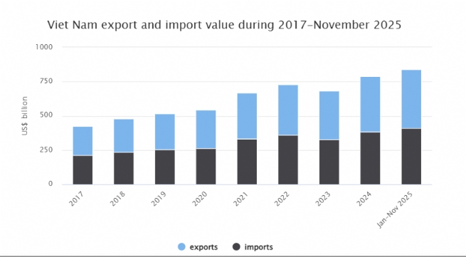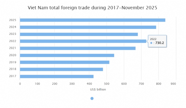 Vietnam’s trade with the rest of the world in the first 11 months of this year reached approximately US$840 billion, a year-on-year increase of 17.2 percent, equivalent to US$123 billion.