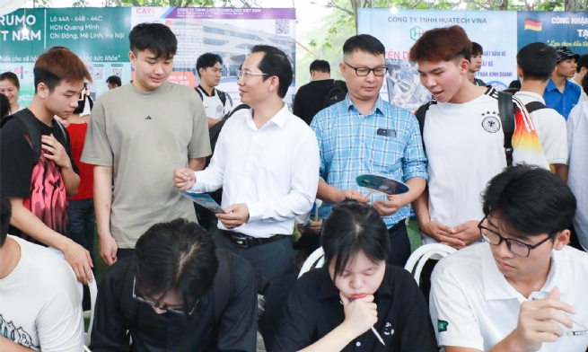 Deputy Director of the Department of Home Affairs Tran Van Ha (white shirt, center) meets with students and shares information on local enterprises’ demand for high-quality talent