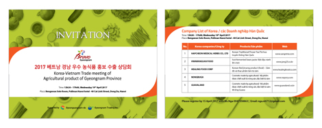 To further enhance bilateral trade between Vietnam and Korea, with the support from Gyeongsangnam province, Gyeongsang Trading Company will host a business matching between a delegation of Korea’s companies in the fields of agricultural and food products and cosmetics and Vietnamese companies in the afternoon of April 19, 2017 at Pullman Hotel, Hanoi.