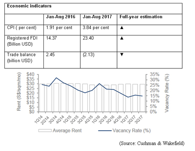 The office market is often directly affected by macroeconomic performance. A better macroeconomic performance will be the basis for a more active office leasing market. The third quarter of 2017 continued to witness positive developments on the Hanoi office market.