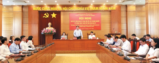 Vinh Phuc province recently held a meeting on U.S. reciprocal tariffs with the business community, chaired by Mr. Tran Duy Dong, Chairman of the Provincial People's Committee, and attended by local leaders and representatives from nearly 50 exporters to the U.S. market.
